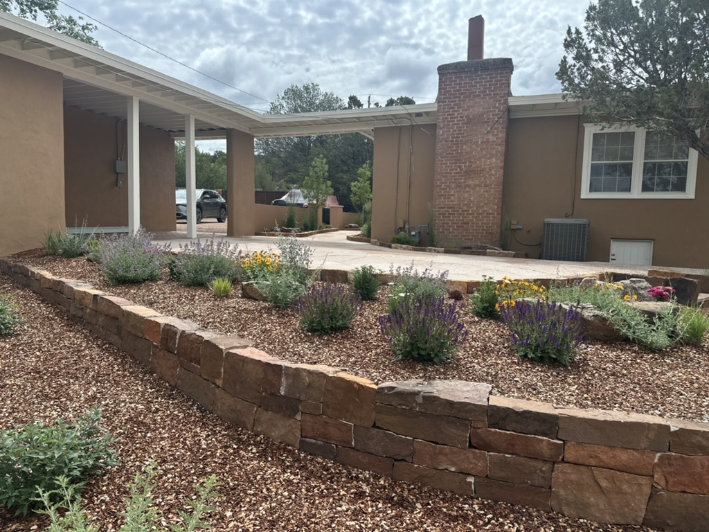 Our rock gardens are very low maintenance, water wise, and also an aesthetically pleasing way to landscape your Santa Fe garden. We always start a rock garden by installing a layer of weed barrier, and we have buried all kinds of unhealthy lawn and plants.